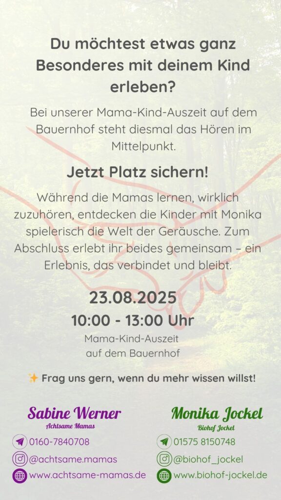 Zusammen mit dem Biohof Jockel haben wir eine ganz besondere Auszeit für dich und dein Kind entwickelt! In dieser Zeit kannst du als Mama in einer Stunde für dich selbst zur Ruhe kommen, dich auf dich konzentrieren und neue Energie tanken. Du bekommst wertvolle Impulse und einfache Übungen, die dir helfen, mehr Gelassenheit und Leichtigkeit in deinen Alltag zu bringen.